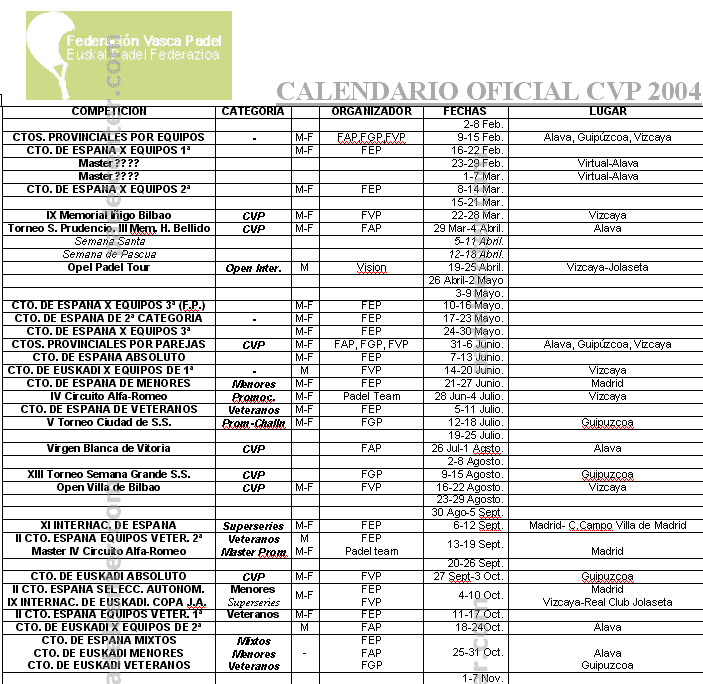Calendario 2004 del Circuito Vasco de padel